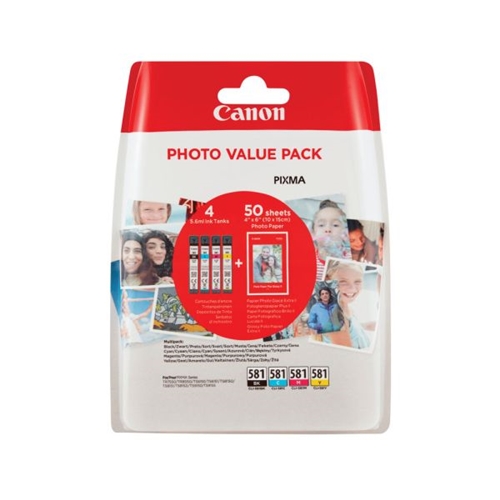 As genuine Canon inkjet cartridges, the CLI-581 Photo Value Pack ensures you receive optimal performance from your Canon printer. With 5.6ml of long lasting ChromaLife100 ink, these standard yield cartridges deliver clear crisp text and rich depth of colour for quality and vibrant photos and documents. This pack contains 50 sheets of Canon glossy photo paper and 1 inkjet cartridge each of Black, Cyan, Magenta, and Yellow.